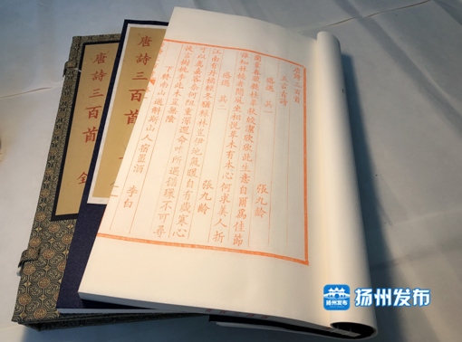为了让扬州活字印刷技艺重新绽放光芒,雕版印刷技艺传承人陈美琦按照《武英殿聚珍版程式》中的标准制作木活字《唐诗三百首》,作品选用全唐诗字体,共计制作2万多个木字丁,每个字丁大小一致,长宽均为1cm,高2.4cm,是当代活字印刷技艺的代表作。