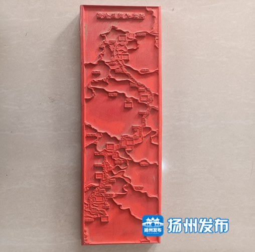 雕版印刷作品《京杭大运河全貌》由扬州广陵古籍刻印社制作设计,历时一个月。作品使用棠梨木刊刻,展现京杭大运河全程风貌,经过写样、上样、引线、扯线发刀、挑刀、铲空、刷印等步骤将这一作品完美呈现出来,是当代雕版印刷技艺的代表作品之一。