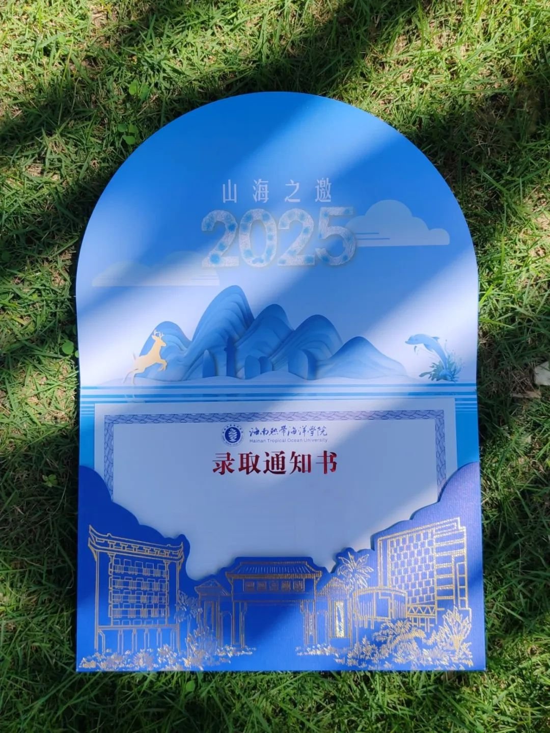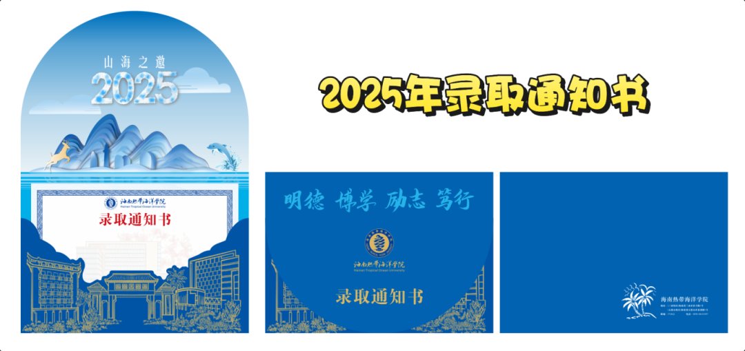 海南热带海洋学院2025录取通知书以“依山傍水,山海相邀”为主题,整体设计以山海蓝为主色系,与热带雨林、蓝天、海洋等元素以及学校的发展理念相契合,彰显学校独有的热带海洋特色。