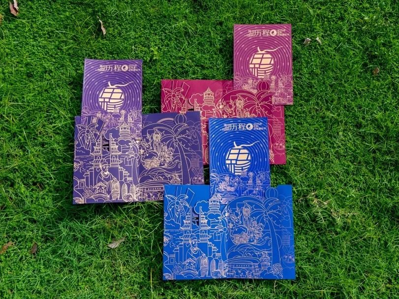 底部封盖,以深海蓝为底色采用击凸烫金工艺,金线绣制两校区地标性建筑轮廓如“南海绢帛载星河”。